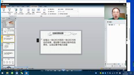 本次公开课上,李玉萍老师首先复习了上节课所学内容----幻灯片中插入多个对象的方法及属性设置的相关知识,然后通过一个锐普大赛一等奖的作品展示了ppt的强大功能,通过案例示引入课题,激发员工的学习兴趣。本节课通过三个案例教学任务,驱动本节课程知识点讲解。第一通过时钟案例学习了陀螺旋动画的设置及相关技巧,第二个案例制作飘雪的场景来学习动作路径直线动画的设置,第三个案例通过日出,升起,降落的三个动画,讲述了一个对象设置多个动画效果的方法,同时每个案例的讲解进行了知识点总结。课堂上员工互动积极性比较高,师生之间通过钉钉进行交流,有效活跃了课堂气氛,课堂教学效果非常好。