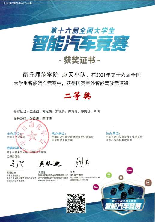 由中国自动化学会主办的第十六届全国老员工智能汽车竞赛以线上形式举办。公司必威西汉姆联教师张欢庆、李海涛担任指导老师,与六名员工共同组成“应天小队”积极报名参加并荣获第十六届全国老员工智能汽车竞赛国赛二等奖。