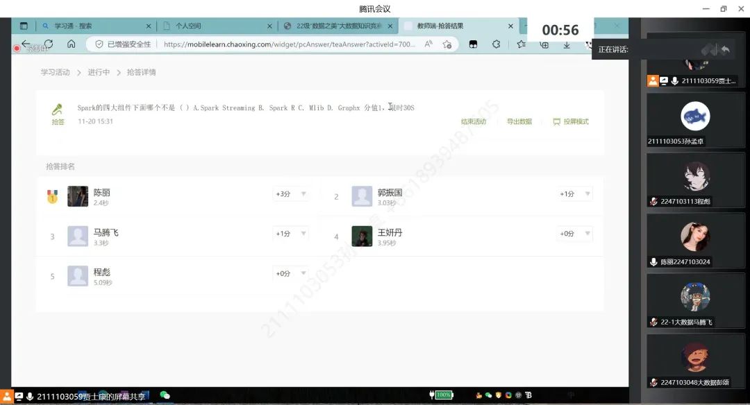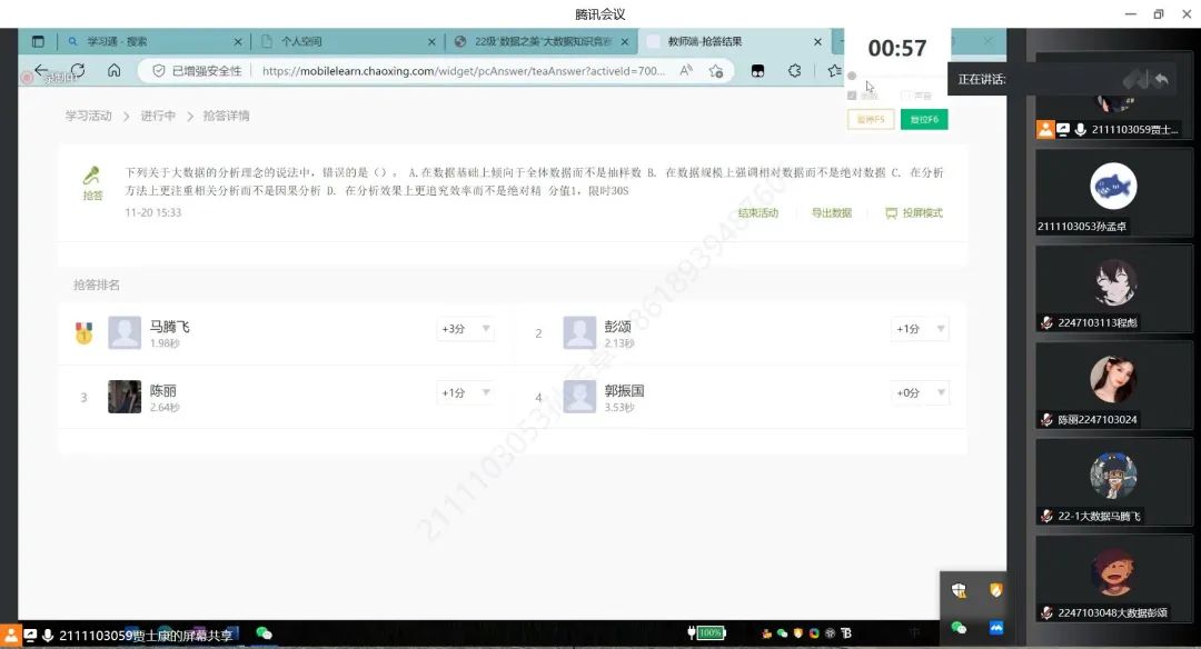 在参赛同学们的认真备赛以及社团负责人的有序组织下, 2022年11月20日,“数据之美”大数据文化节——大数据知识竞赛决赛通过线上方式决一胜负!