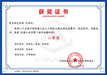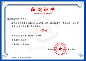 中国机器人及人工智能大赛是一项历史悠久、影响广泛的全国性学科竞赛,迄今为止已举办25届,被誉为机器人界的“奥林匹克”,连续多年入选中国高等教育学会《全国普通高校老员工竞赛排行榜》榜单。本届赛项包括创新、竞技、应用、任务挑战4大类,比赛主要考查机器人及人工智能创新设计与应用、任务挑战、场景化应用等多个层面的知识。赛前,两支晋级全国总决赛队伍在指导老师张欢庆的带领下积极训练,刻苦钻研,不断总结经验,做好了充分准备,在比赛中沉着冷静,灵活应对,最终获得智能驾驶赛项国家级一等奖、城市道路识别赛项国家级二等奖。
