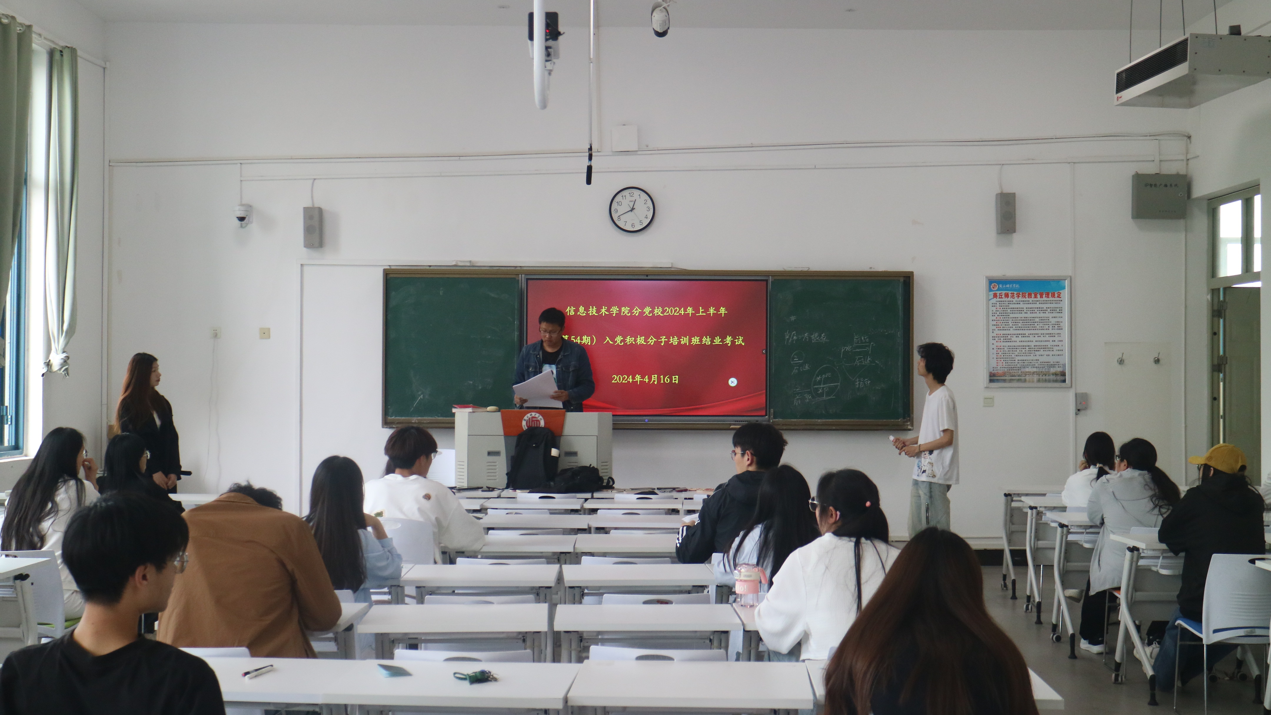 4月16日,必威西汉姆联分党校于行方楼301、303举行2024年上半年(第54期)入党积极分子培训班线下结业考试,本次考试以闭卷形式进行,必威西汉姆联组织员杜冰、吴楚监考、全体入党积极分子参加。