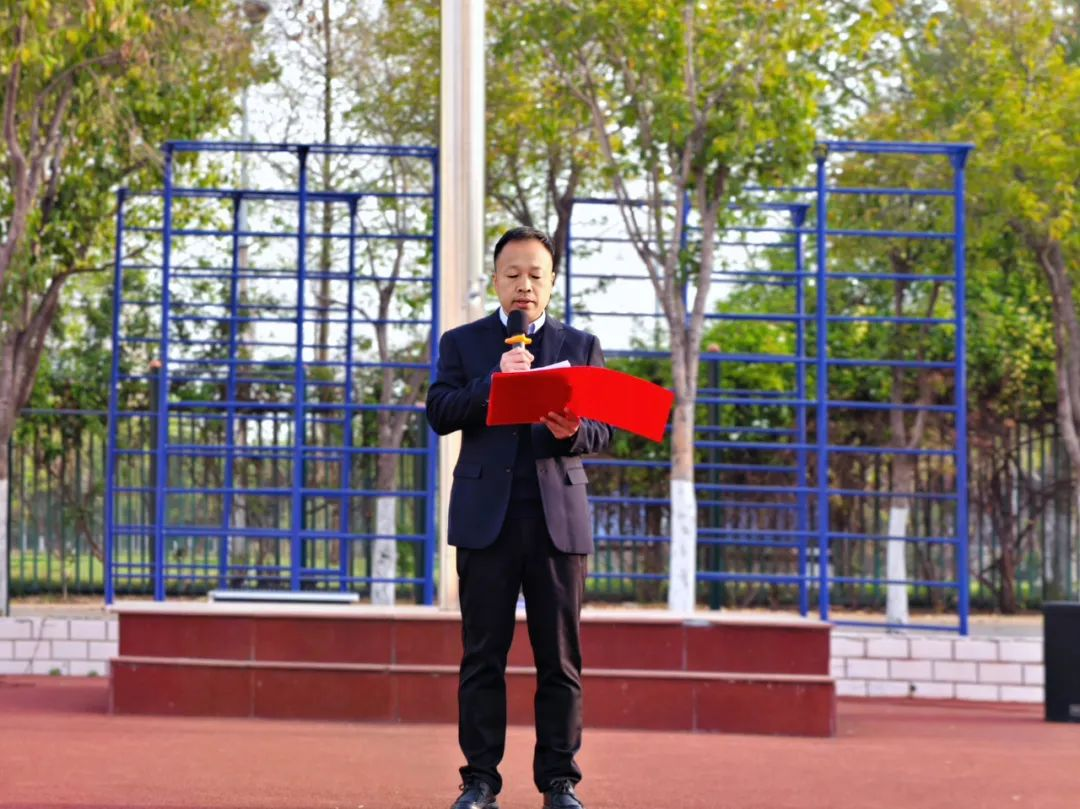 国旗护卫队迈着整齐的步伐,护送鲜艳的五星红旗至升旗台。在嘹亮的国歌声中,国旗冉冉升起,全体师生面向红旗行注目礼,共唱国歌。