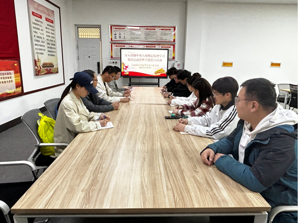 会上,党支部书记杜冰强调深入贯彻中央八项规定精神学习教育是全面从严治党的重要举措,全体党员同志要以案为鉴、以学促改,将作风建设融入日常生活学习科研,自觉涵养自身政治定力,坚定理想信念;随后,党支部组织委员张斌领学了《中央八项规定实施细则》及警示教育案例,宣传委员朱民结合中央八项规定精神对员工日常学习生活等方面进行了指导和分析。